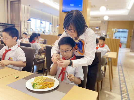 同学们左手叉右手刀,轻轻切,慢慢嚼。安静用餐,身体端正,高雅气质从小培养。英语课程承担着提高学生综合人文素养的任务,即学生通过趣味英语课程,能够开阔视野,丰富生活经历,形成跨文化意识。这样的课堂,同学们在享用特色美食的同时,也增强了对英语学习的兴趣。沉浸式课堂体验也是英语课程生活化,社会化、实践化的体现。