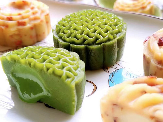 王子萱同学先向孩子们介绍了绿豆糕制作的方法:先把绿豆浸泡去皮,现在也可以直接买去了皮的绿豆。接着将绿豆磨成粉,里面加入黄油和麦芽糖进行炒制,再加入蔓越莓葡萄干,把这些材料揉成团,绿豆糕就可以动手制做。同学们迫不及待戴上袖套,团呀团,搓呀搓,模具按压、成型,一个个高颜值、口味佳的绿豆糕新鲜出炉。