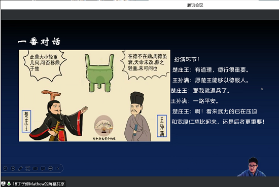 他还重点为我们讲述了问鼎中原的故事,甚至创设了有趣的对话,邀请同学们线上互动,让分享更有趣味。