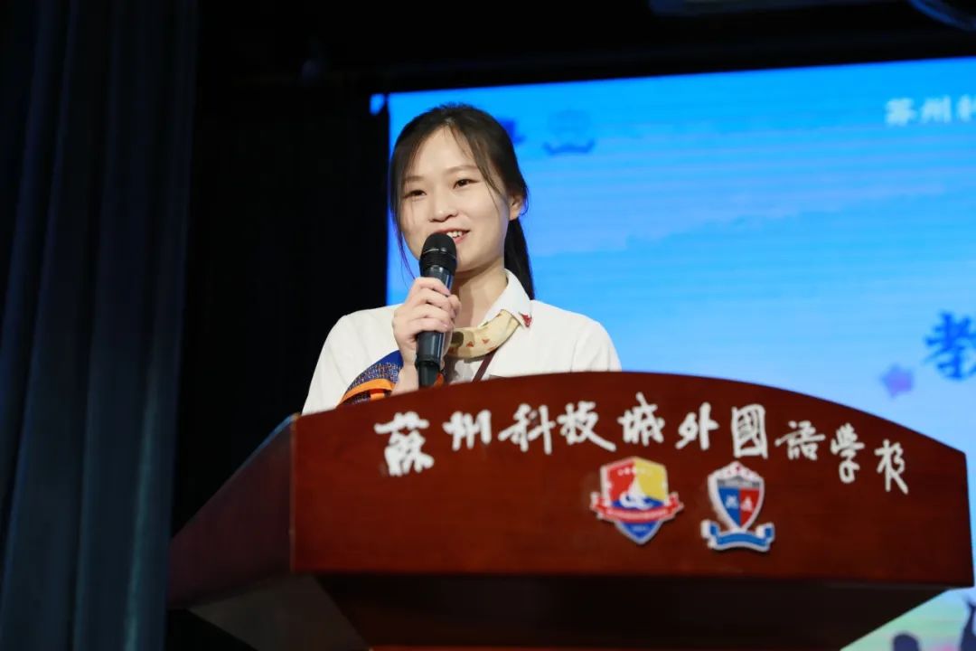 学生代表黄琪轩同学发言:“在初三最后一年,我们切实享受到中考前五星级的待遇,食堂变着花样给我们加餐,中考三天更是开辟出独属初三的金榜题名之餐。晚课期间,在灯火通明的走廊里,班里班外都是各科老师忙着答疑的身影,他们都是我们背后坚定的助力者。隔着走廊的玻璃,能看到偌大的绿茵操场,也能欣赏傍晚粉红交映的晚霞,我们很快就将像霞光告别天际一般与这里的一切说声再见,但无论走向哪里,我们都不会忘记昔日的同窗师长,不会忘记苏科外,就像我们的主题:青春永不散场!”