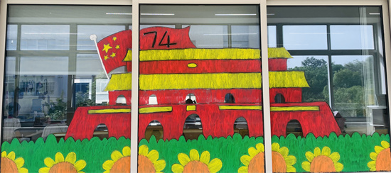 既然要营造艺术氛围,那就让教室的每一面墙都艺术起来。走廊的文化主题是“品读经典,畅游华夏”,那就是两个关键词“经典”和“华夏”。我们选取了本学期语文快乐读书吧要求孩子们读的神话故事中的四大神兽“青龙、白虎、朱雀、玄武”的形象画在了涂鸦墙上。为了迎接十一国庆节的到来,我们在用玻璃蜡笔在窗户上画了国庆主题的绘画。