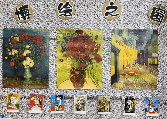 教室里的四面墙也是各具特色。教室前面是孩子们共同创作的佛手画。书柜边上设置了“博绘之窗”,张贴了梵高和毕加索的画,多看一些名家的作品,也能让孩子们的审美有一定的提高。
