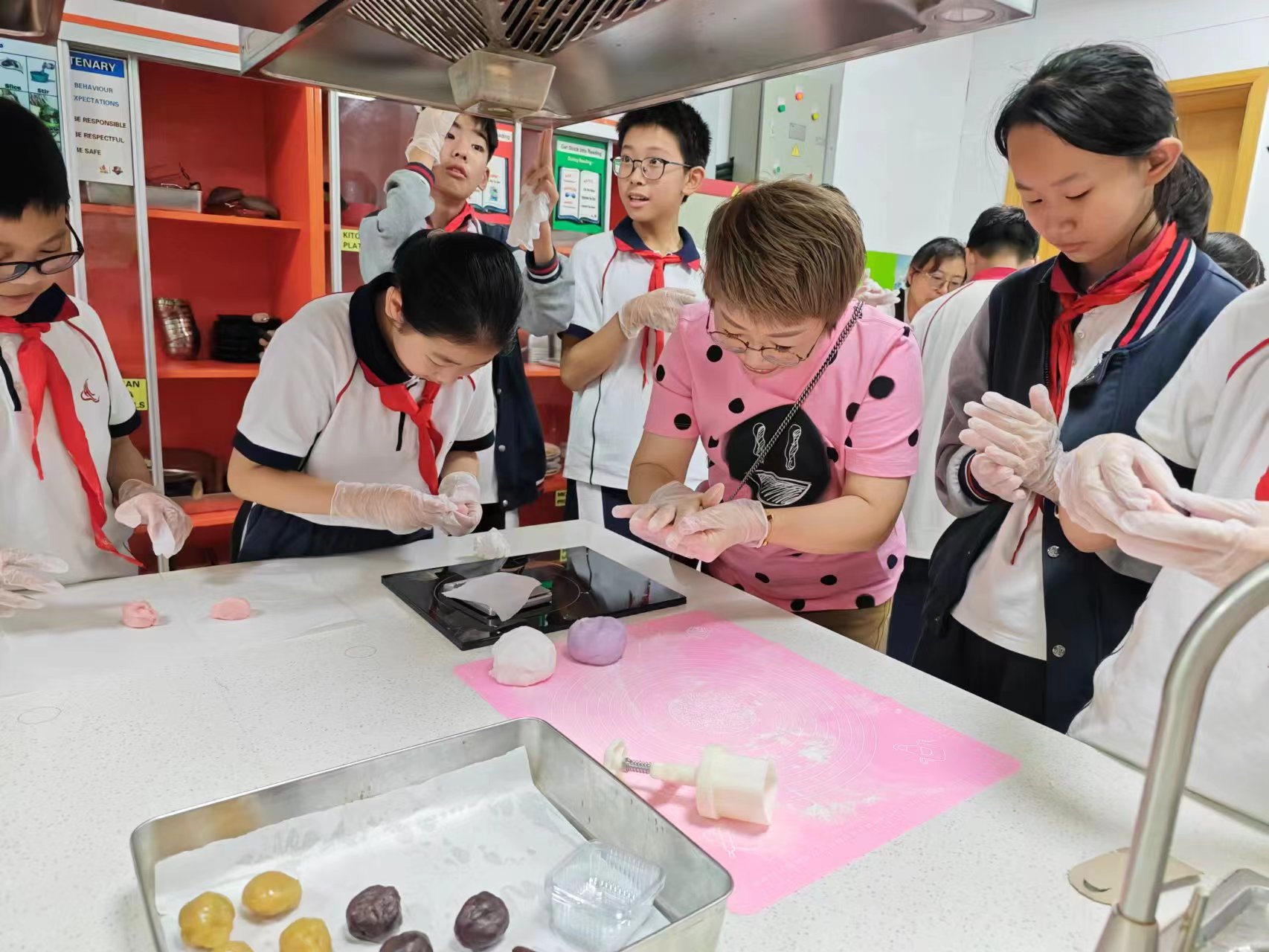 活动也得到了六(1)家委的大力支持,有六位妈妈亲自来到现场教学月饼做法。有力促进了家校的联系,让家长更加深入地了解了苏科外教育的特色。
