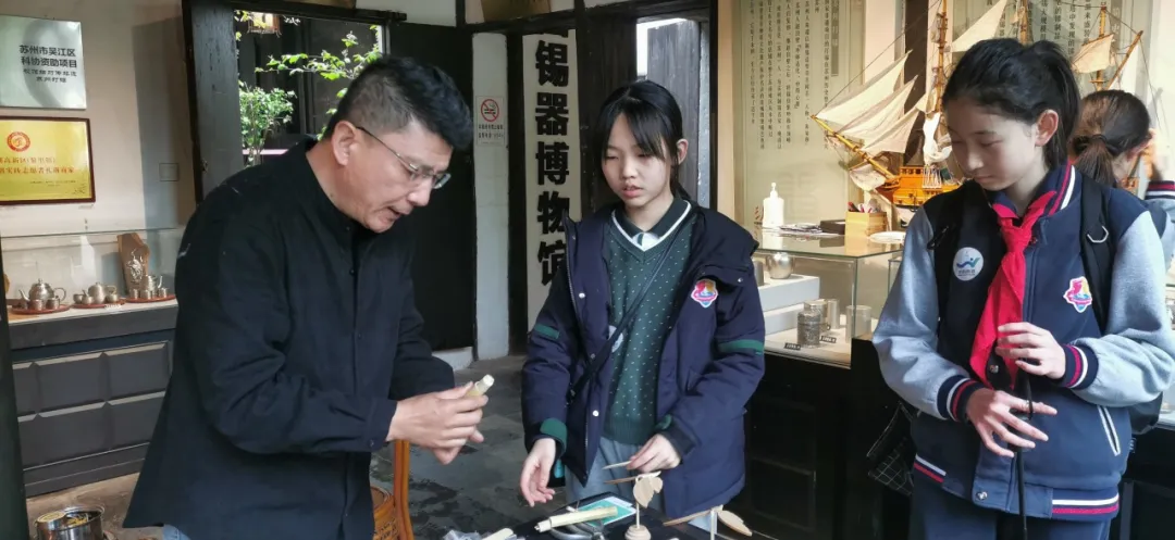 同里古镇、黎里古镇是一个充满艺术气息的地方,在来这前,细心的同学们通过研学单就已经提前进行了解了绣品、雕刻、糖画、通草堆画、锡匠等,而此刻就能近距离接触了,大家都更加专注的看着、用心感受着。