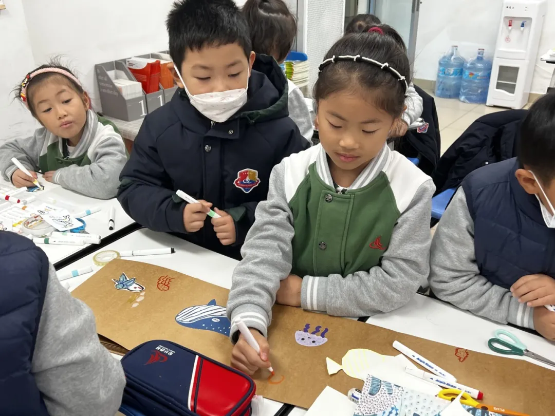 在双语乐活审美课程中,一年级的孩子已启动物种重生计划,让学生了解不同生态环境下的濒危物种、灭绝生物、现存生物造型,并通过观察、想象与创作,将搜集的资料进行提取,表达对生物的喜爱、对生物多样性的关注。