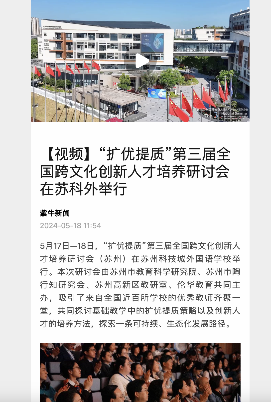 【顶思】5月17日—18日,“扩优提质”第三届全国跨文化创新人才培养研讨会(苏州)在苏州科技城外国语学校举行。