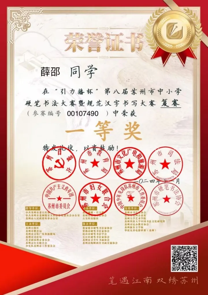 在第八届“引力播杯”苏州市中小学硬笔书法大赛中,我校参加人数再创新高,其中获得特等奖2人,一等奖4人,二等奖7人,三等奖19人,朱牧、徐妍睿两位同学荣获总决赛特等奖,陈梓月、薛邵、杨允墨、李谦等获得一等奖。