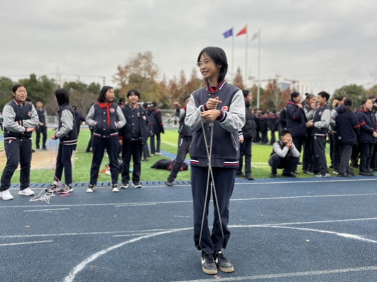 跳双飞比赛即将开始,同学们一个个精神抖擞、摩拳擦掌。但随着时间的逝去,跳绳的同学显然有些累了,可一想到身后有一群为自己加油的同学,又重新调整心态,顺利地完成了比赛。