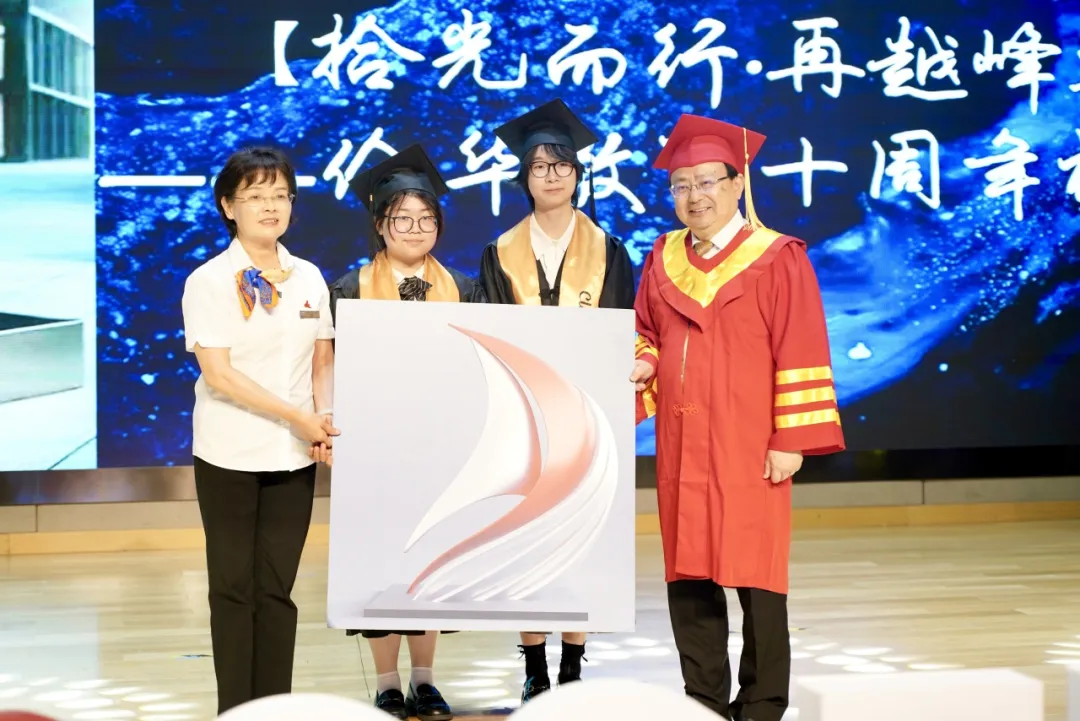 莘莘学子手捧鲜花致敬恩师,更在伦华教育十周年之际,以一座隽永雕塑“红韵银辉 博慧拾光”献礼母校,将拳拳感恩之心化作永恒的校园印记。