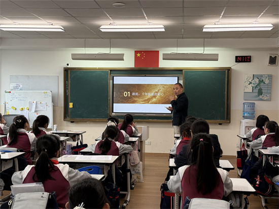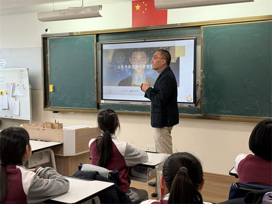 讲堂上,家长从神农尝百草、黄帝问道岐伯的古老故事切入,生动讲述了中医的起源与核心思想,将“平衡、和谐、整体”的中医理念拆解为通俗易懂的知识。他还讲解了阴阳五行与五脏的关联、四季养生的要点,以及十二时辰对应的身体节律,让孩子们明白顺应自然规律的重要性。情绪与脏腑的联系、“正气存内,邪不可干”的养气之道,更是让孩子们懂得呵护身心的双重意义。最后,“杏林春暖”“坐堂行医”的故事,让孩子们感受到中医里的仁心与大爱。