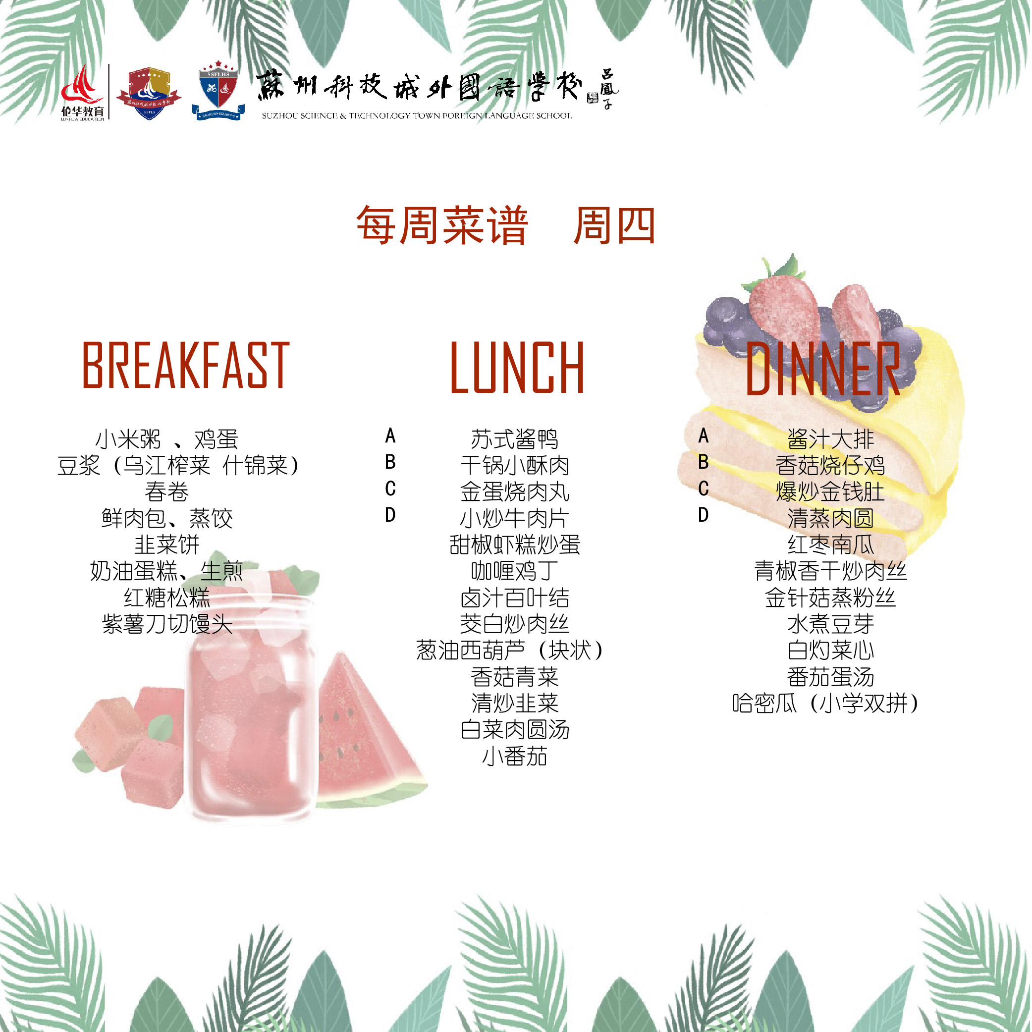 苏州科技城外国语学校4月6日至4月9日菜谱