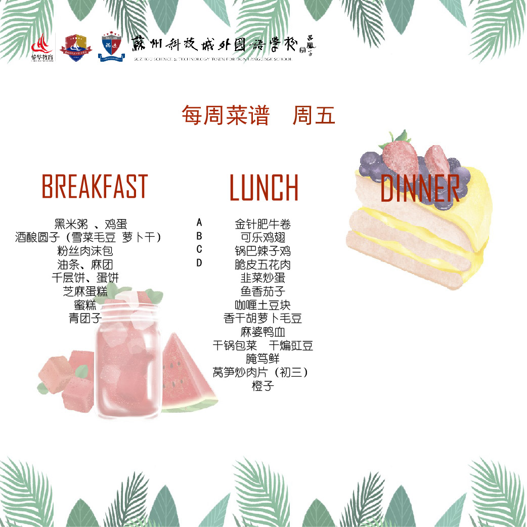 苏州科技城外国语学校5月31日至6月4日菜谱