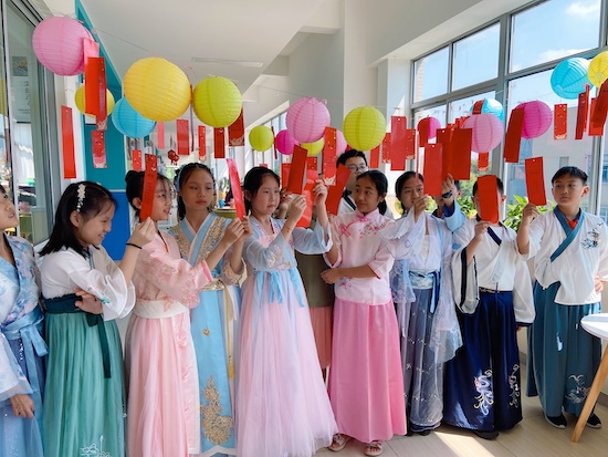 活动当天,大家着古装、查资料、自制灯谜。老师与学生共同在教室文化走廊进行布置,挂好灯谜和灯笼,提前为活动做好准备。