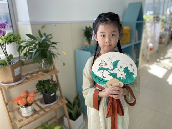 有了这种的氛围,画扇也变得诗意起来。水粉颜料、调色盘、铅笔、橡皮擦,眼前这些看似普通的画具,在孩子们的手中变化出不同的色彩和创意。荷花、兰花、蝴蝶……最后再再旁边写上诗句:荷花娇欲语,愁杀荡舟人;兰溪春尽碧泱泱,映水兰花雨发香……