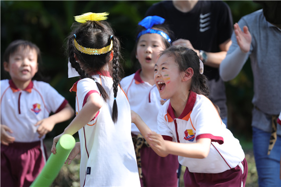 近60人被分成了4个“原始部落”通过部落装扮、竞选酋长,展示各自的风采,来到原始竞技场开始了真人版水果连连看、蒙眼格斗等有趣又锻炼孩子的小游戏。
