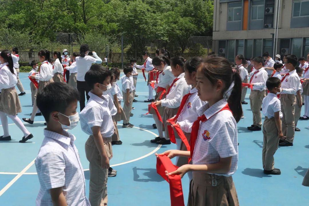 伴随着激情高昂的出旗曲,新生入队仪式正式开始。一年级的孩子们唱响《中国少年先锋队队歌》,戴上鲜艳的红领巾,庄严宣誓、呼号。从孩子们笃定的眼神中,我们相信,他们一定会牢记党的教诲,全面发展,茁壮成长!