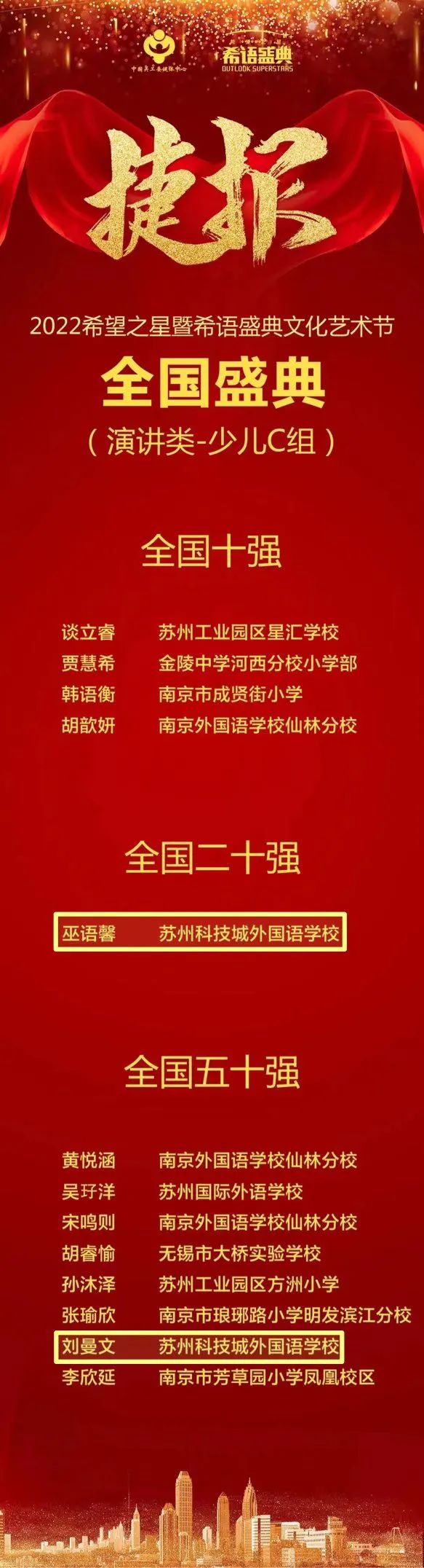 在“2022美育中国说”英语演讲比赛的全国赛中,小学学子们同样喜获“收金”大丰收,一举获得8个全国特金奖,16个全国金奖,12个全国银奖,23个全国铜奖!