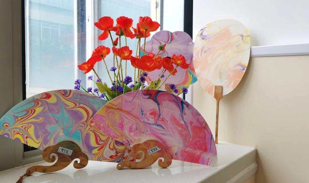水拓画又叫“水中画”,名列世界非物质文化遗产名录。老师带领小朋友们尝试在水中作画:在水中用五彩缤纷的色彩,渲染出天马行空的创意,再将华丽的抽象画拓印在扇面上,创作独一无二的水拓扇面。