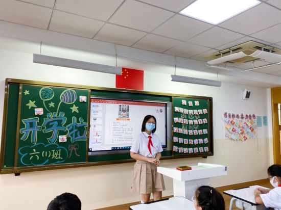 开学典礼正式开始前,六1班的全体师生齐聚在宽敞明亮的新教室。