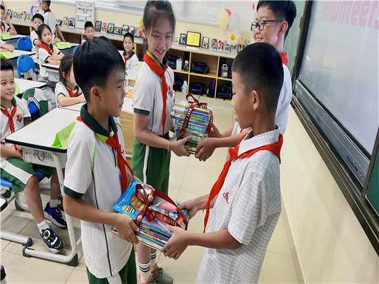 图书漂流是一段奇妙的旅程,今天五8班的哥哥姐姐将曾经阅读过的英文书籍传递给三5班的孩子们,继承书香,继承知识,继承友爱的文化。