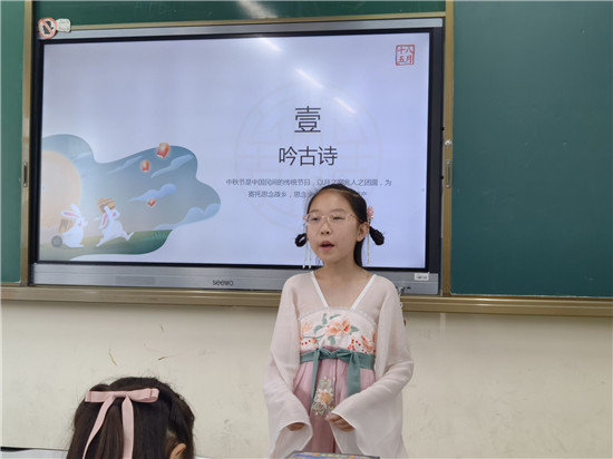 中秋佳节是中国每年一度的传统节日,在这个阖家欢庆的重要节日里,我们的孩子更要能够领略中华名族的传统文化魅力,耕种民族自信和自豪。在四年级举行丰富多彩的传统文化活动中,我们班本次组织赏月、吟诗、品月饼、猜灯谜活动。