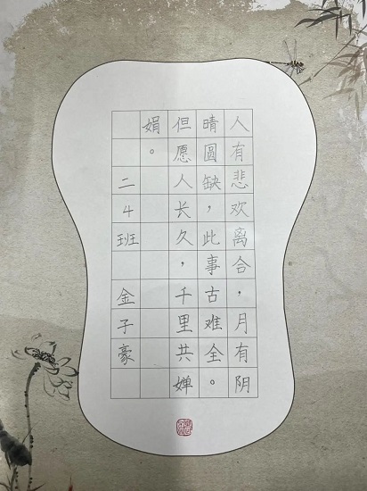 宋词在沉浮人海里,脱樊笼、眷烟火。提笔即是情,落笔皆有意。在本次的戏剧嘉年华中,二4班的孩子们举笔挥毫,宋词的魅力更彰显于他们的一笔一画中。