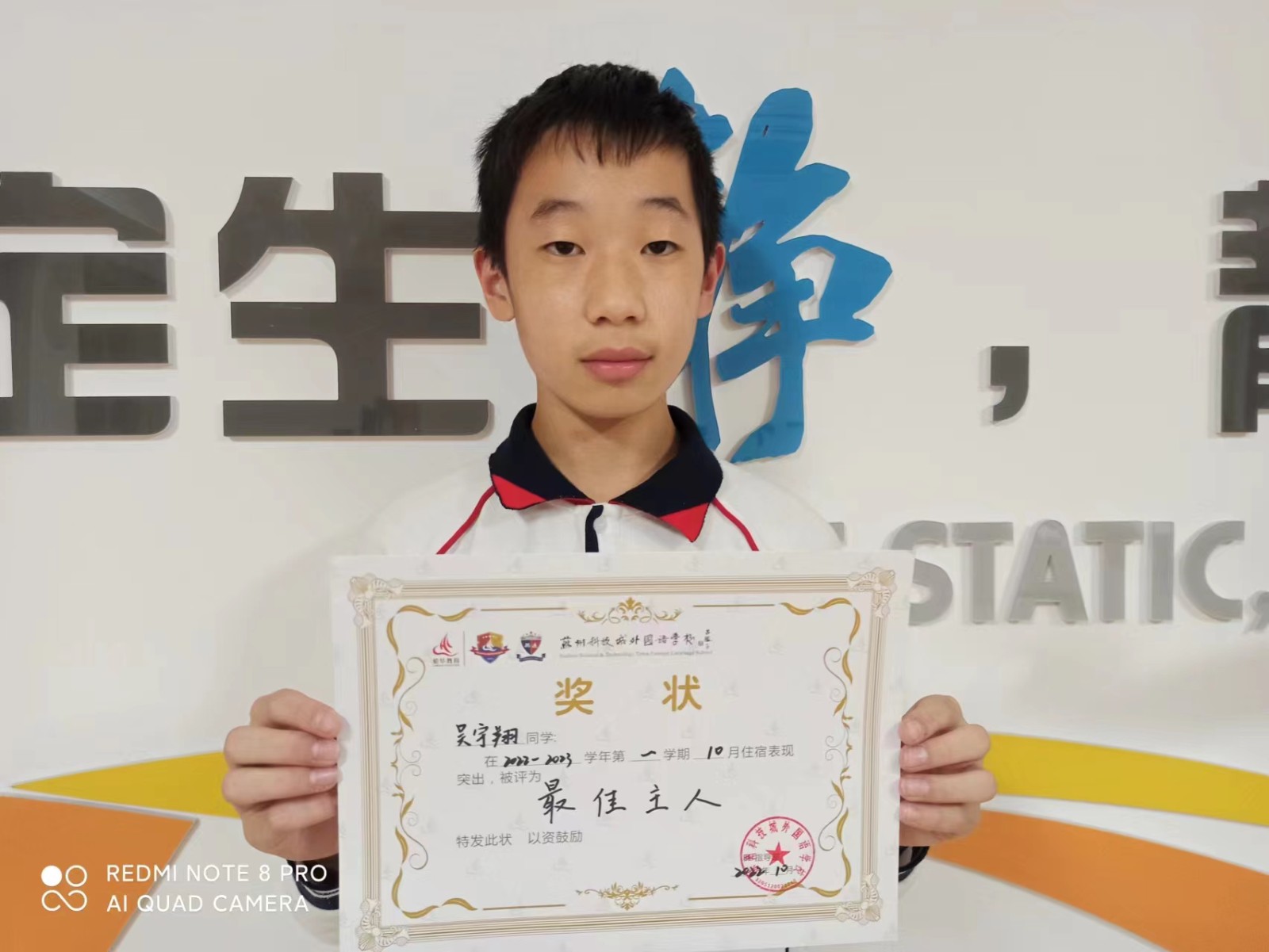 “温馨之家,共同营造”,本月住宿同学中他们表现出严格的自律精神和强烈的主人翁意识,他们是: