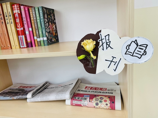 班级的左前方,还有我们的图书角,里面全是同学们爱看的书,底下还有我们班一起订的报刊,每天都可以及时看到今天的大新闻。