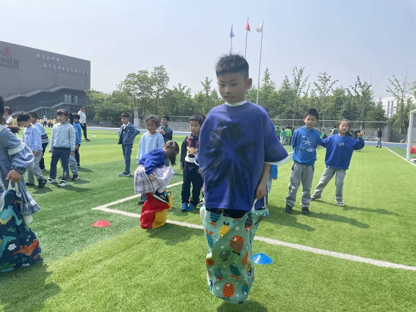 活动还没开始,外教主管Fay短短几句话就把氛围拉满,小朋友们都摩拳擦掌,迫不及待了。第一项活动是袋鼠跳,小朋友们把小脚放进袋子里,一蹦一跳地往前进;接着,我们骑在弹力球上,像骑着小马一样,小朋友们快乐极了。