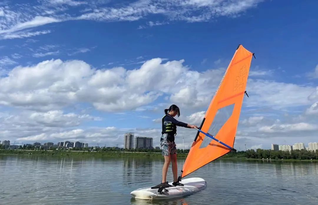 融合三部 八年级 王予鸣(帆板):暑假,学习帆板说走就走。在教练的带领下,我带着落水的恐惧第一次在帆板上站了起来,慢慢熟悉步伐,第一次拉起帆,非常神奇,我的帆板就像展翅的蝴蝶,在水面点水,虽然随时有落水的风险,但我知道,直面我内心的恐惧就是成长。经历了两次落水以后,我放松了很多,可以身体站直,肩膀打开,手臂自由转换帆杆,我放松呼吸的时候,天呐,我第一次站在江面上欣赏蓝天白云,太美了!