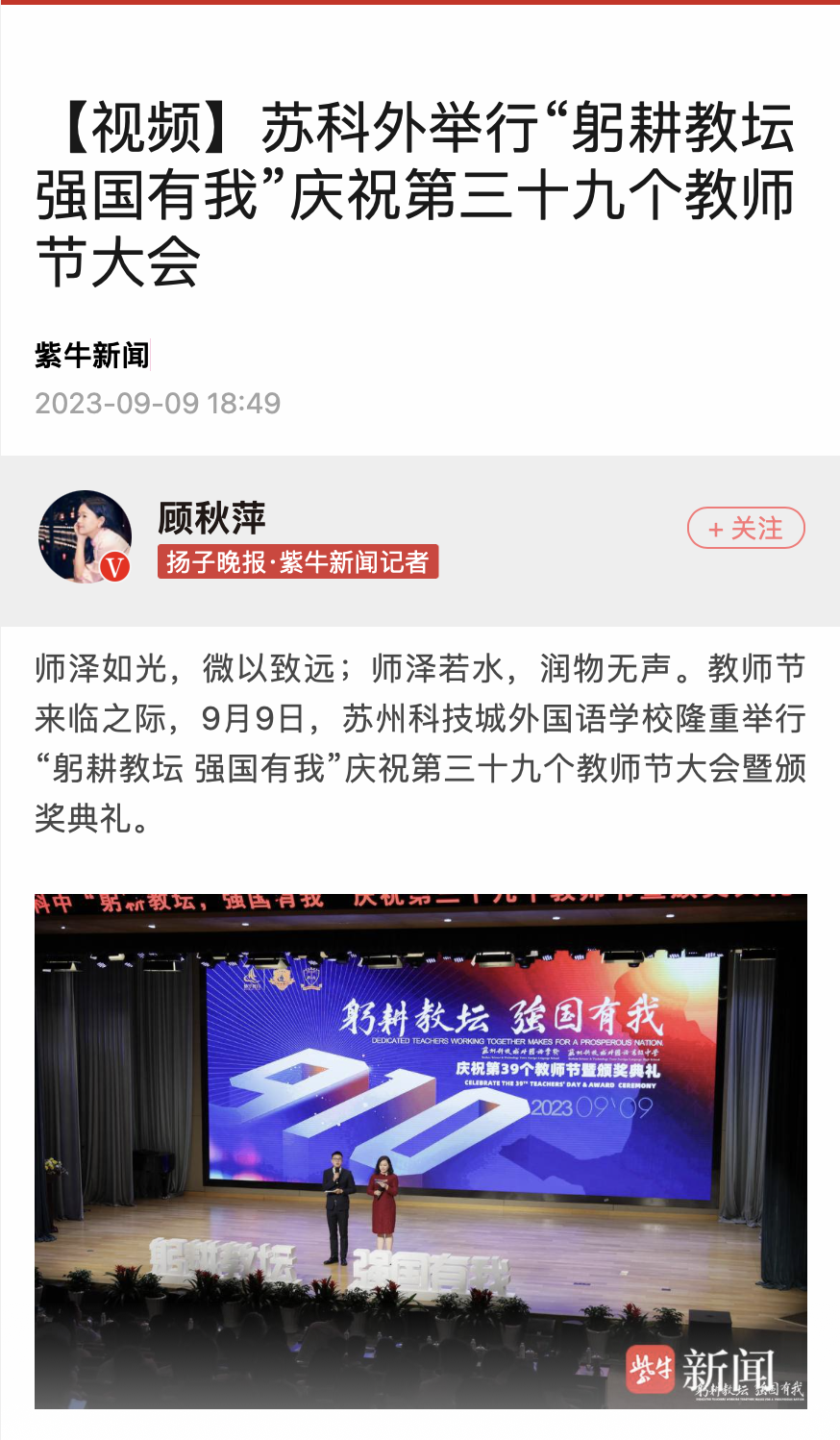 【紫牛新闻】苏科外举行“躬耕教坛 强国有我”庆祝第三十九个教师节大会