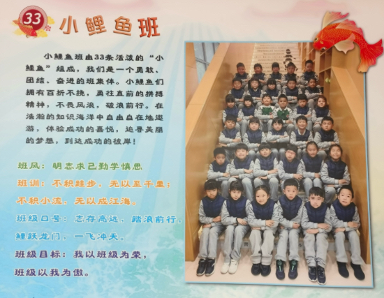 各种作品展示承载着我们小鲤鱼们大大的梦想,班级以我为荣,我以班级为傲。在未来的日子里,我们33条小鲤鱼将更加紧密团结,不断努力进步,互相学习,相互促进,共同进步。以百折不挠,勇往直前的拼搏精神,不畏风浪,破浪前行。