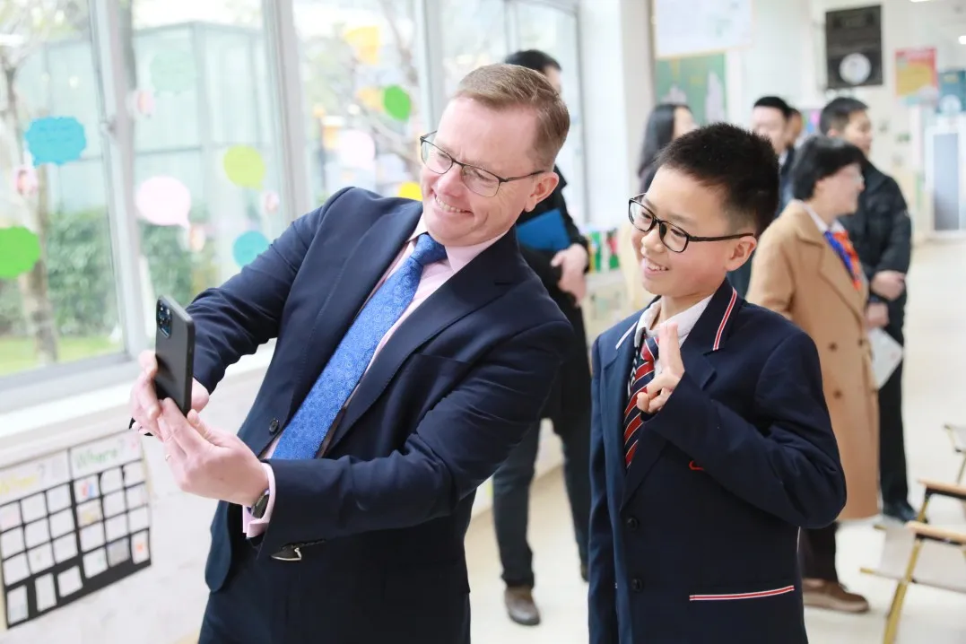 一年前,何梓洋主动承担起融合二部“校园大使”志愿者的工作。每当有来访嘉宾或参观团队,他总是能自信地站出来,用流利的英语向他们介绍融合二部的各个方面。无论是教学设施、课程设置,还是同学们的学习成果,他都能娓娓道来。同时,他还积极参与线下开放日和线上宣讲活动,向更多人展示学部的风采。