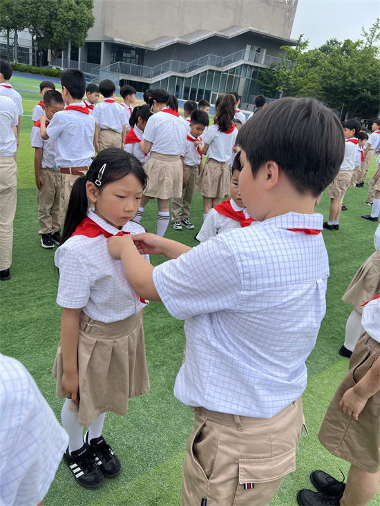 盼星星、盼月亮,终于盼到少先队员新队员入队仪式的采排了。午饭后,孩子们在餐厅整好队,快速跑到操场,准备给新生系红领巾。