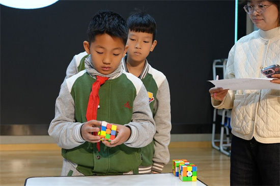 比赛当天,孩子们手捧五彩斑斓的魔方,眼中闪烁着期待与兴奋。随着裁判的一声令下,小选手们迅速进入状态,手指在魔方上翻飞,宛如魔术师在表演神奇的法术。时间一秒秒流逝,魔方在他们的手中逐渐还原成最初的模样,每一次成功都引来观众们的阵阵欢呼。、