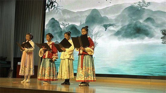 当音乐响起,舞台上的同学们身着古装,仿佛从历史的画卷中走来。王若佳的声音清澈如泉,她以柔美的语调开启了这场诗词的盛宴;王梓沐则以坚定而充满力量的声音,展现了诗中的豪情壮志。五9班的同学也不甘示弱,他们的朗诵抑扬顿挫,充满了情感的波动。她们的声音交织在一起,如同和谐的交响乐,为观众带来了一场视听的享受。