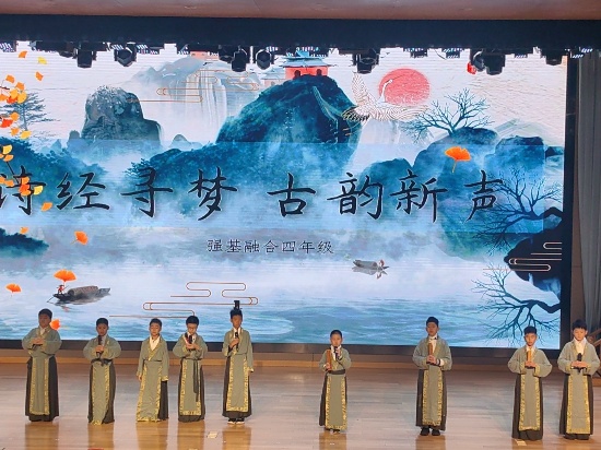 古人云:诗者,天地之心也,《诗经》讲述着古老的故事,凝结着生命的道理,也描绘着中国人自古以来对美好生活的向往,今天就让我们一起来品读这部中国古代诗歌的开端《诗经》。四2班的孩子们为我们带来歌曲《诗经.小雅》开篇之《鹿鸣》。男女生合唱热烈欢快,清新淳朴的诗经雅乐穿越千年,感染了每一位师生、家长,彰显苏科外学子儒雅气韵。