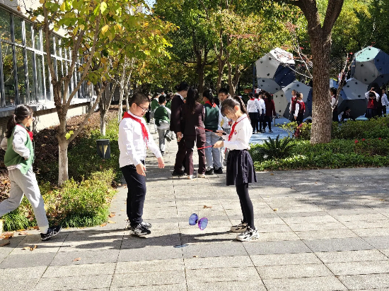 同学们在校园的小径上欢快地玩着空竹,清脆的笑声和空竹的嗡嗡声交织在一起,构成了一曲美妙的校园乐章。