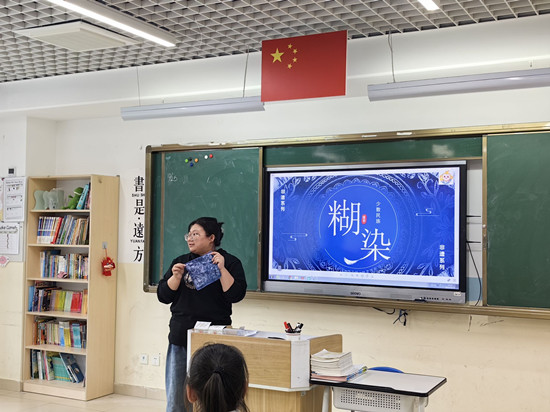 在金色的十月,四12班迎来了一场别开生面的家长进课堂活动。本次活动邀请了拥有丰富非遗文化传承经验的家长,为学生们带来了一堂生动有趣的糊染课程。课堂上,家长老师首先向学生们介绍了糊染的历史渊源和文化内涵,让他们对这种传统技艺有了初步的了解。随后,家长老师详细讲解了糊染的制作步骤和技巧,并现场演示了如何制作一幅精美的糊染作品。