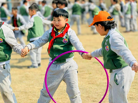 游乐时光:无动力设施区域成了欢乐的海洋。孩子们在滑滑梯上飞速滑落,在秋千架上悠闲荡漾,在攀爬网中挑战自我,欢笑声回荡在整个区域。“一圈到底”展现孩子们的团队协作能力。