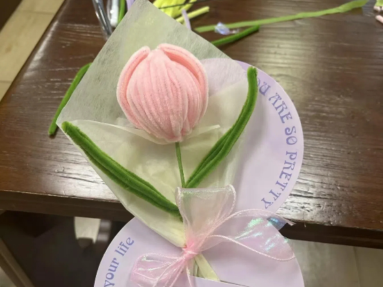 在老师的指导下,孩子们迫不及待地动手制作。他们认真挑选喜欢的颜色,小心地扭动、折叠,将一根根普通的扭扭棒变成栩栩如生的花瓣。有的同学还别出心裁,在花蕊处点缀亮片,或为花朵配上绿叶。虽然手法稚嫩,但每一朵花都饱含心意。小华同学笑着说:“我要做三朵,代表‘我爱你’!”