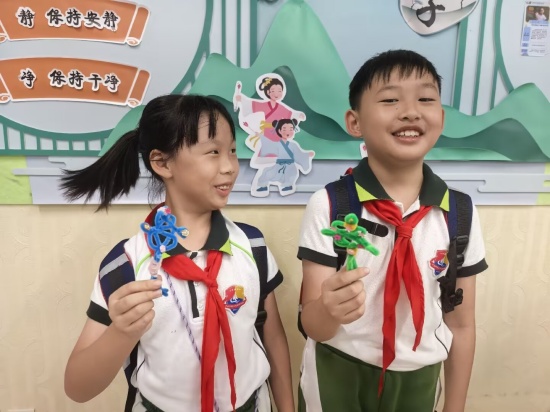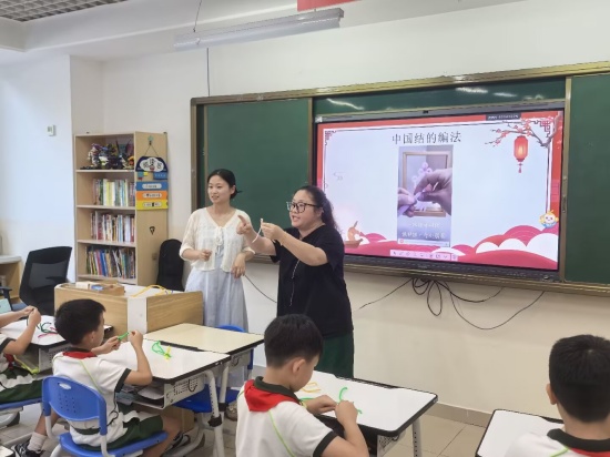 五彩细绳分发到每个孩子手中。顷刻间,一条条细绳仿佛被注入了生命,化作灵动的小龙,在稚嫩的指尖相遇、缠绕、穿梭、游走。起初,手法难免生涩,绳子也不那么“听话”,但在互相帮助和鼓励下,重复着穿、拉、勾、收的动作,最初的杂乱线条逐渐变得规整。不一会儿,一个对称而紧实的结体已初具雏形,小小的成就感洋溢在一张张专注的脸庞上。尝试加入第二根、第三根细绳,结形也更显饱满。随着最后一步定型,一个个凝结着耐心与巧思的中国结终于诞生在孩子们手中。它们或许不算完美,但每一件作品都独一无二,饱含着亲手创造的喜悦。